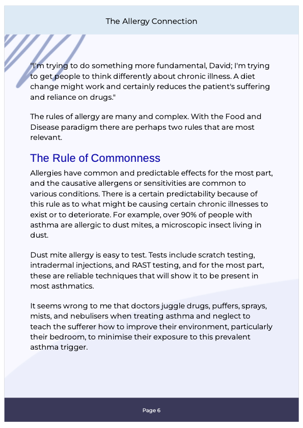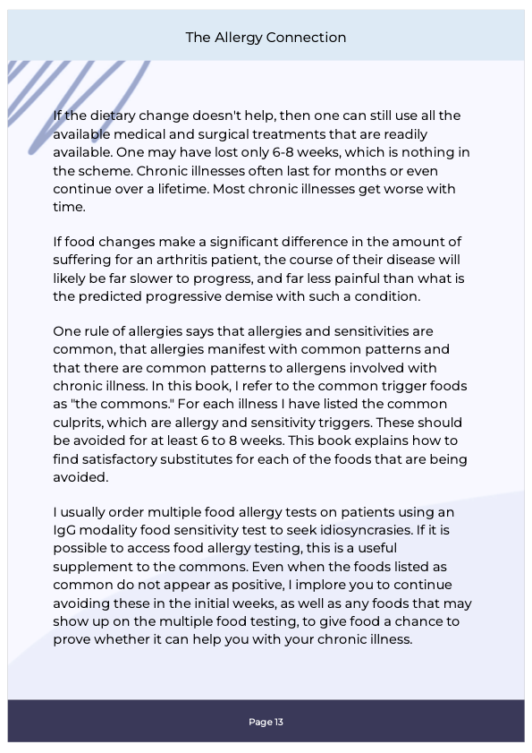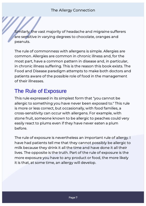 Allergies are common. Allergies are common in chronic illness, and for the most part allergies have a predictable pattern. The Allergy Connection book explains the food and disease paradigm and in particular, the relationship with specific foods and specific chronic illness.